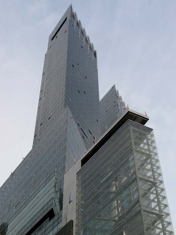 The site of 900 Eighth Avenue tower on 18 September 2002. AOL Time Warner Center is rising beyond, with the Central Park Place and Trump International Hotel & Tower on the right. This view of AOL Time Warner will soon be blocked by a crystal tower of Hearst Magazine Building.