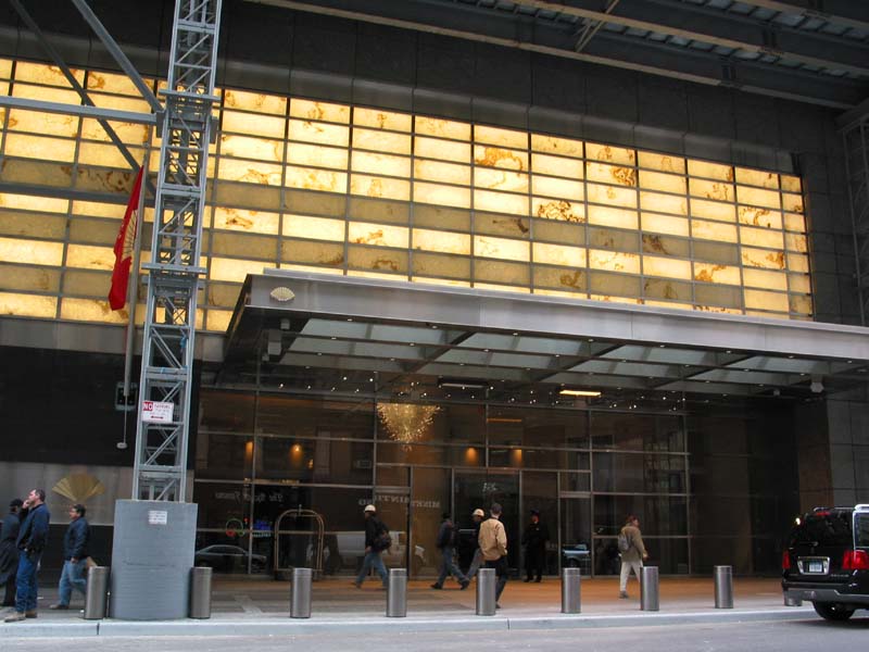 About Mandarin Oriental, New York at Time Warner Center is situated at the northwest arc of Columbus Circle. Steps away from Central Park, this unrivaled location offers the best of New York’s cultural epicenter. Renowned performance venues such as Lincoln Center and Carnegie Hall are within walking distance, while the world-class shopping of Madison Avenue and Fifth Avenue are but a stroll through Central Park. Guest Rooms 251 sophisticated and luxuriously appointed guestrooms including 48 suites with stunning views of Central Park and the Manhattan skyline Restaurants & Bars Asiate – a trend-setting restaurant capturing the elements of European and oriental cuisine Mandarin Oriental Lobby Lounge – light refreshments, afternoon tea and late night desserts MObar – a lively atmosphere for pre or post dinner drinks Meetings and Conferences A total of 7,000 sq. ft of meeting space including 4 meeting and function rooms. State-of-the-art audio visual capabilities. Health & Fitness Exclusive 14,500 sq.ft Mandarin Oriental Spa offering a complete 'journey of the senses' High performance fitness center including a 75-foot naturally lit indoor lap pool. Location 80 Columbus Circle at 60th Street New York, NY 10019, USA Click here to display the map of Mandarin Oriental New York Reservations Make reservations at Expedia.com Make reservations at Travel Now.com Photographs The entrance to Mandarin Oriental New York Hotel on 11 November 2003.