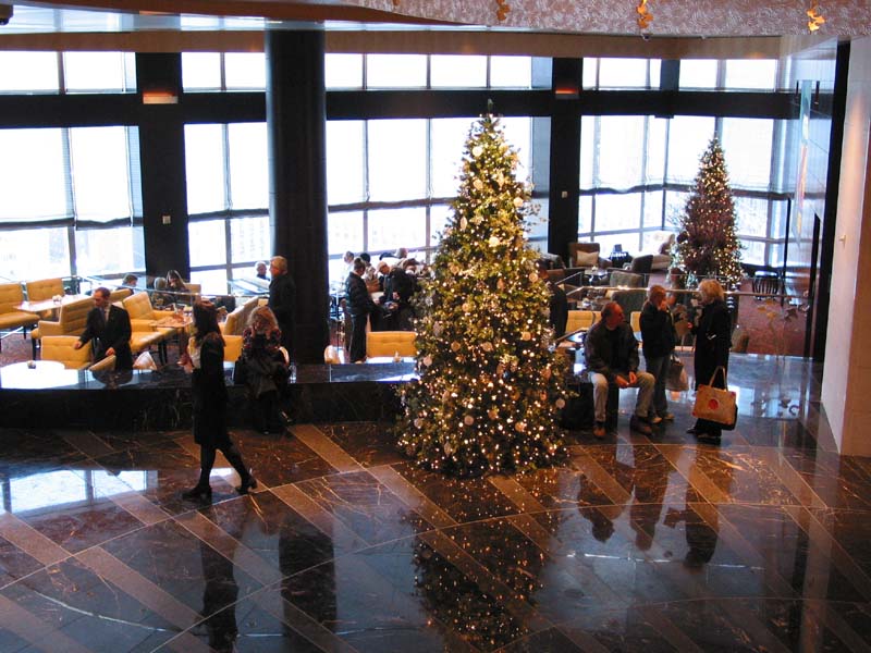The bar and the Christmas tree in the new Mandarin Oriental New York Hotel.