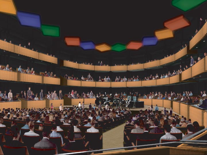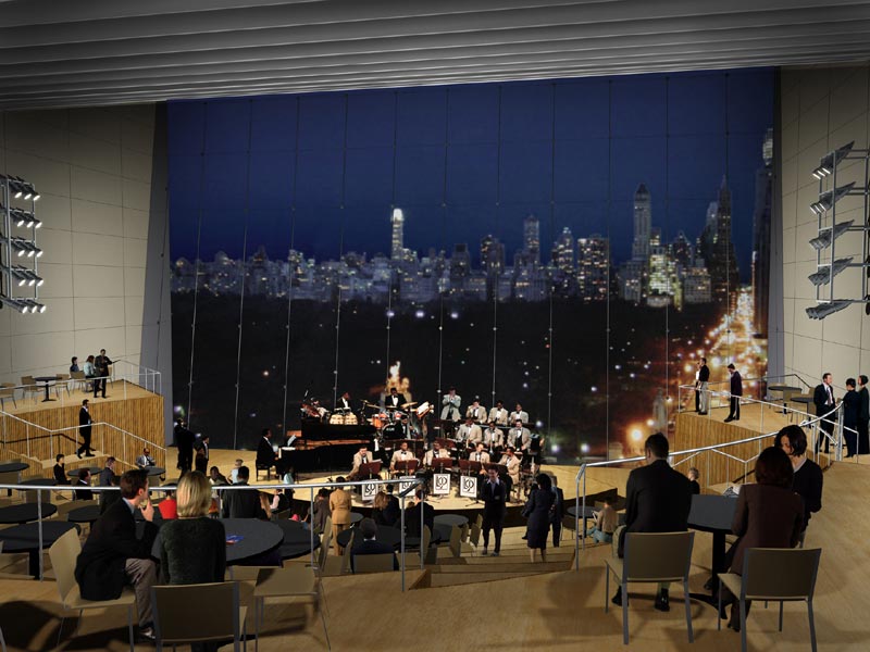Information and pictures from Jazz at Lincoln Center Jazz at Lincoln Center's new home: a multi-room facility perched above Central Park, with bandstands posed against soaring walls of glass and a dance floor laid out beneath the moon and stars. Scheduled to open in fall 2004, the $128 million, 100,000-square-foot facility will be the world’s first performing arts center designed specifically for jazz. The Allen Room A 600-seat performance atrium, also named The Allen Room, provides an informal and intimate setting, with views through a 50-foot-high glass wall overlooking Central Park. Recalling a Greek amphitheater, tiered platforms ascend from the stage level to a dance floor with movable tables and chairs, allowing the audience to interact with the musicians. Beneath a skylight open to the stars, the musicians play against the backdrop of the Manhattan skyline.