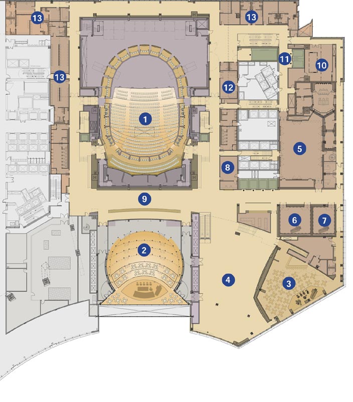 Floor Plan 1. The Rose Room 2. The Allen Room 3. Jazz Cafe 4. Lobby and the Ertegun Jazz Hall of Fame 5. Education, Rehearsal, and Recording Studio 6. Education and Rehearsal Studio 7. Classroom 8. Production Office 9. Lobby 10. Technical Operations Center 11. Back Stage Entrance 12. Green Room 13. Dressing Rooms