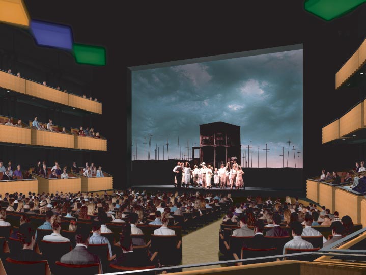 Concert Theater The 1,100-1,300-seat concert theater, also named Frederick P. Rose Hall, is designed for jazz but also accommodates opera, dance, theater, film, and orchestral performances, while maintaining a sense of intimacy and involvement between performers and audience. Through the use of movable seating towers, the hall can be set up with a proscenium for opera and dance or can provide the immediacy of a jazz setting by surrounding the musicians with the audience, seated on three levels. The full 90-foot fly and rigging can be closed for concerts so as not to compromise the acoustics. The stage, at 111 feet by 65 feet, is large enough for a full opera production, while the audience chamber measures only 80 feet from stage to uppermost tier. Jazz/Orchestra Mode